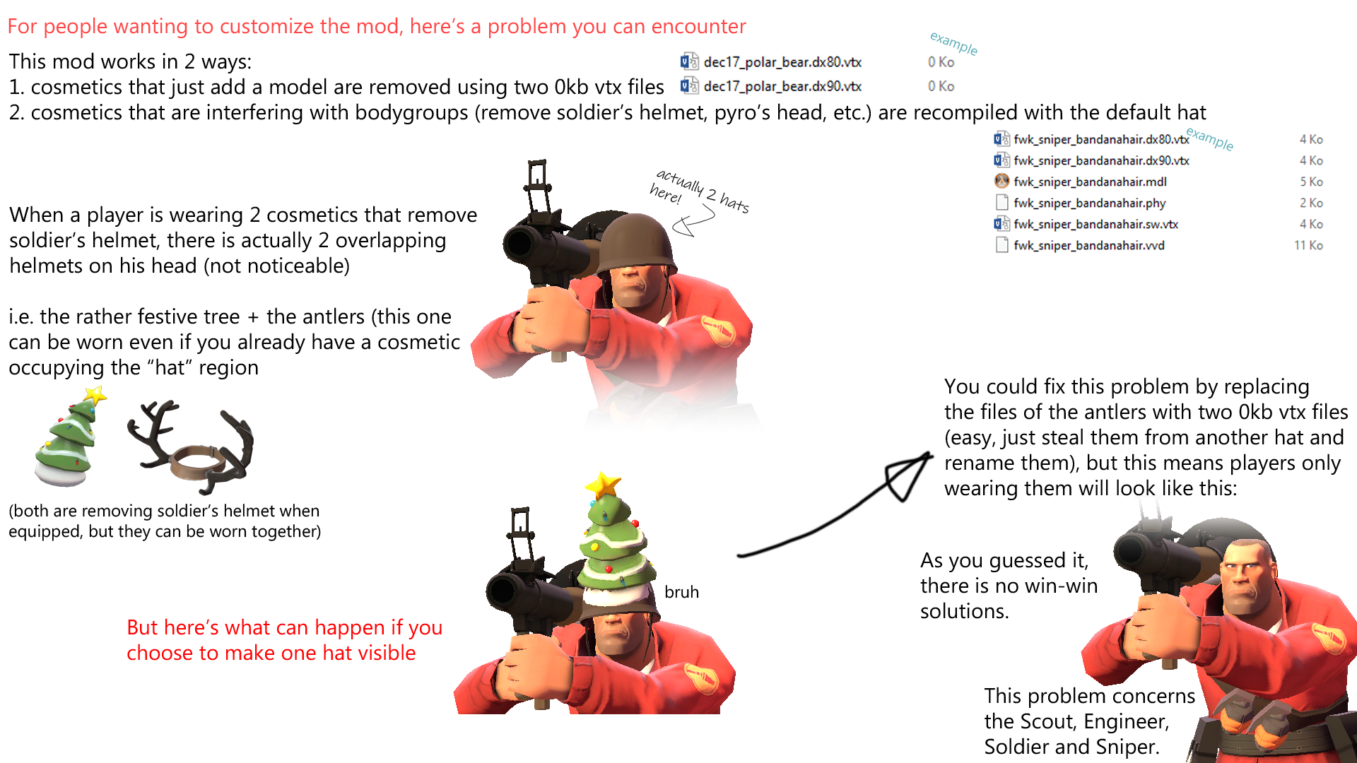 Note: a problem can arise when creating a custom version of no-hats-bgum, where cosmetics appear clipped inside default headgears. It isn't a problem with this program, but with how no-hats-bgum is made (and there is no fix). See this image for more information.